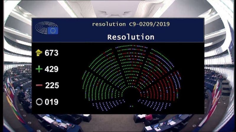 Glacadh seo le haontaí 429, 225 i gcoinne, agus 19 a choimeád ar fionraí. Glacadh an réiteach maidir le heigeandáil aeráide agus comhshaoil le 430 vóta ar son, 190 in aghaidh, agus 34 a choimeád ar fionraí maidir le comhdháil aeráide na Náisiún Aontaithe i 2019 i Madrid, an Spáinn (COP25).